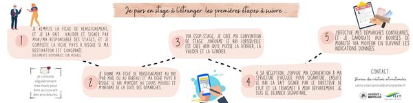 A la réception de la fiche de renseignement, le BRI vous contactera pour vous accompagner dans la suite des démarches administratives: réalisation de la convention de stage, candidature aux bourses de mobilité, visa etc. -