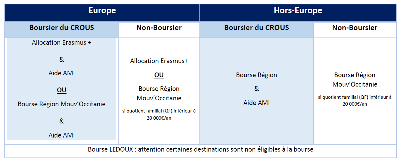 - Si vous êtes boursier.e du CROUS, vous conserverez pendant la période de mobilité votre bourse nationale et vous obtiendrez l'aide AMI. Par contre, il faudra choisir entre l'allocation Erasmus+ ou la bourse de la Région Occitanie.