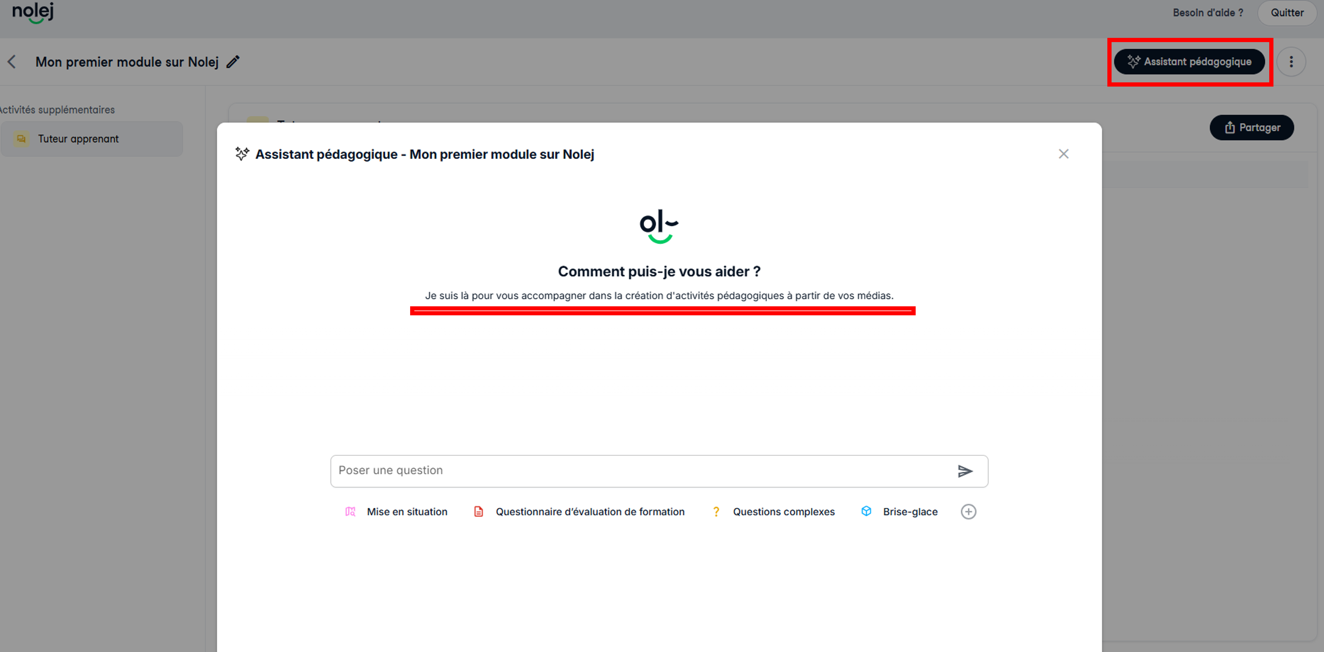 À ne pas confondre avec l'assistant pédagogique : le tuteur apprenant proposé dans Nolej s’adresse aux étudiants et s’appuie uniquement sur les contenus que vous avez intégrés dans le module.